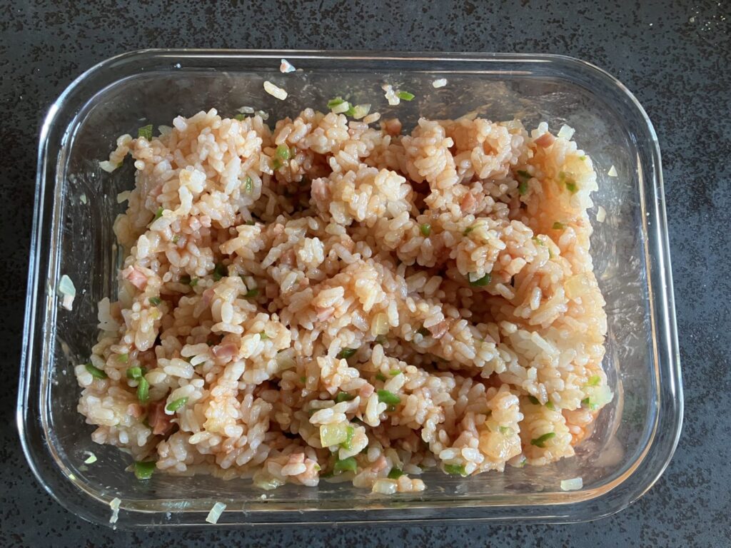4.ごはん、具材、調味料を混ぜて600wで1~2分加熱(各調味料はお好みの加減で。)