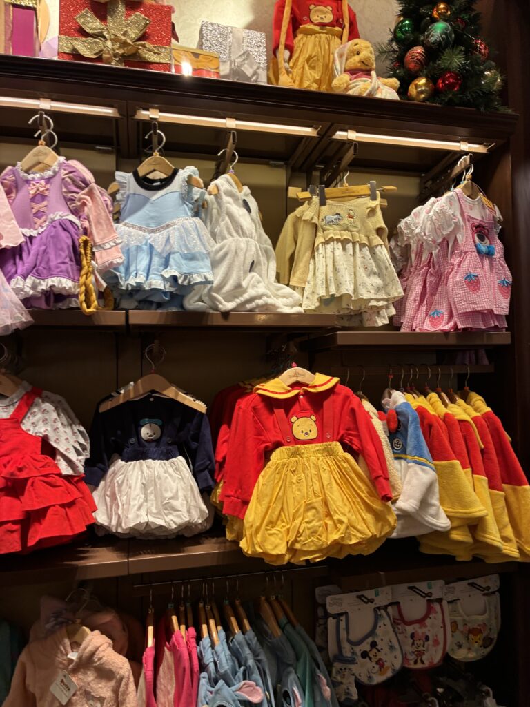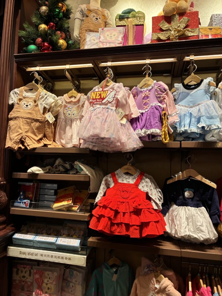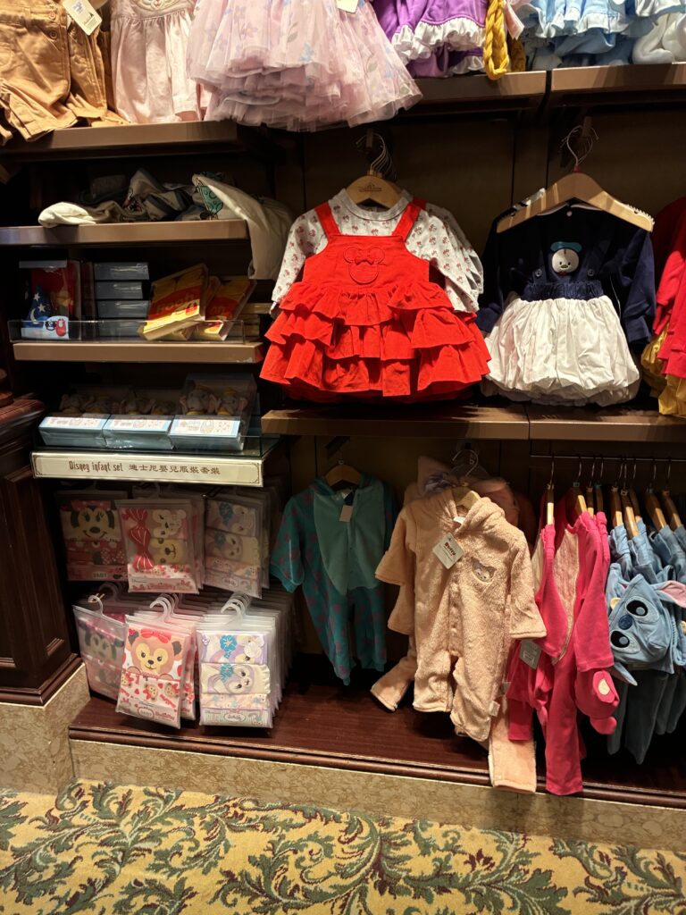 メインストリートUSAには、ダッフィとリーナ・ベルのサロペットや、もこもこ生地であたたかそうなロンパース、小さめサイズのワンピースやTシャツなどがありました。