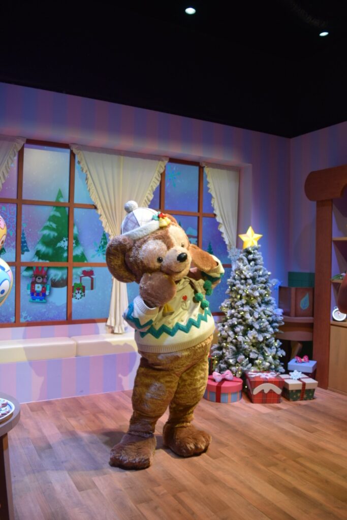 ダッフィー&フレンズ:プレイハウスでは、ダッフィ達が冬のコスチュームで登場。
