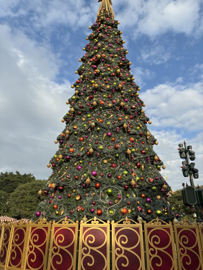 香港ディズニーランドのメインストリートUSAのシティホールの近くには、巨大なクリスマスツリーが飾られていました。