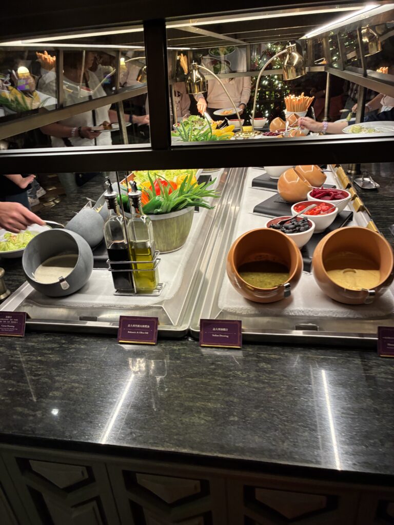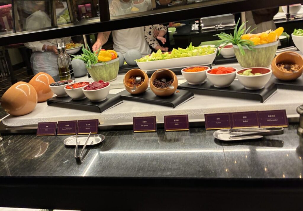 サラダやフルーツ、スイーツなど、ビュッフェコーナーには種類豊富な料理が並んでいました。