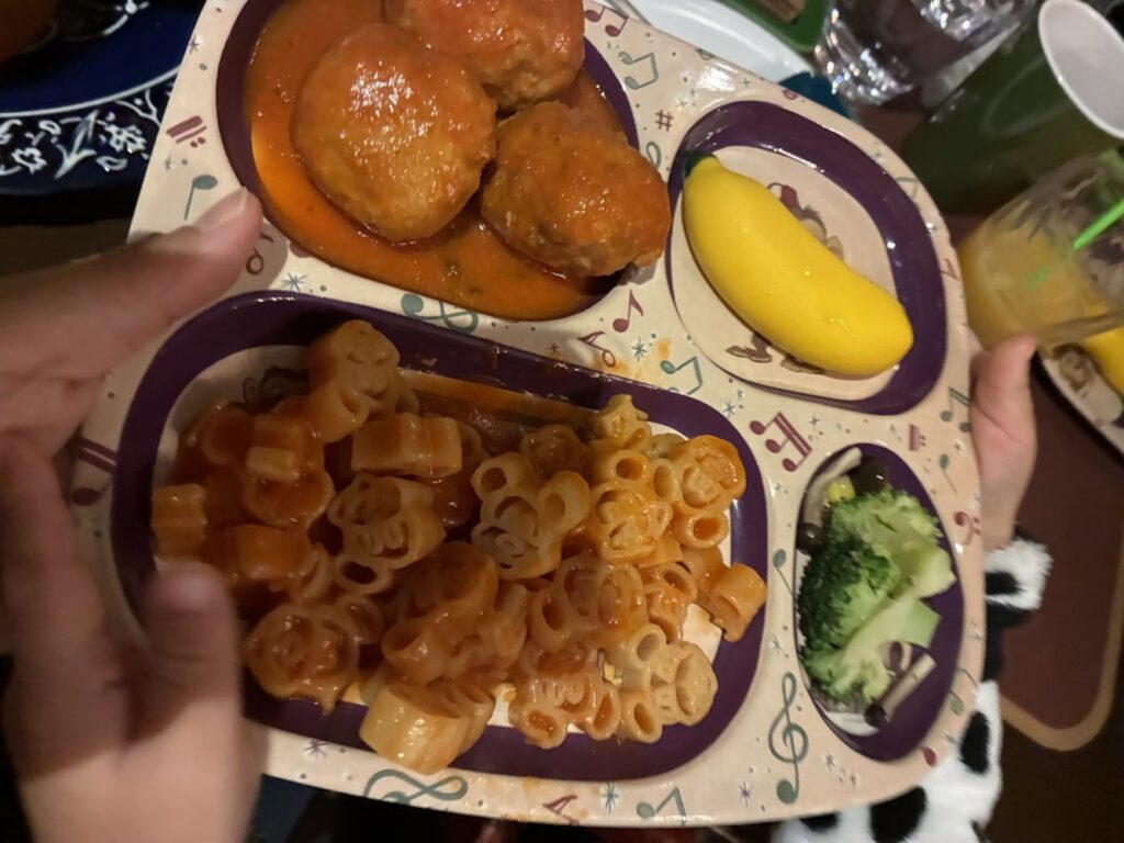 子どもメニューは、ミートボールと、ミッキーの形をしたマカロニのペリネ。ブロッコリーときのこ、バナナのデザートもありました。