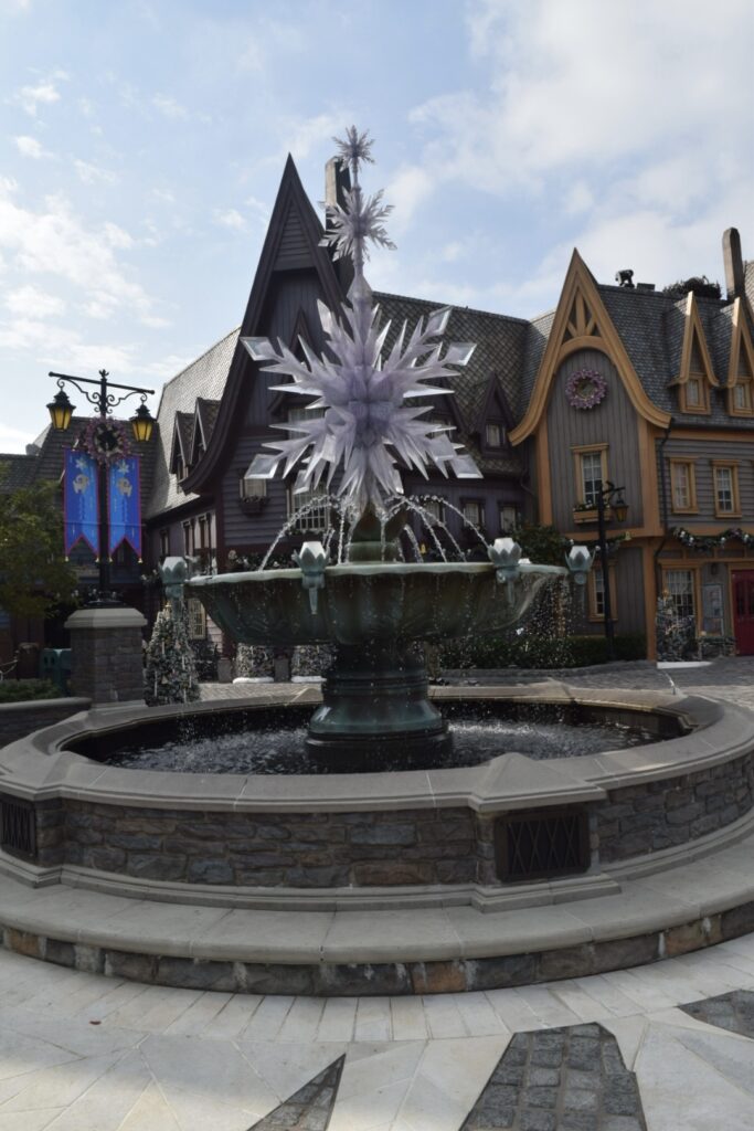 アレンデールを象徴するような氷の結晶があしらわれた噴水は、写真撮影の人気スポット。