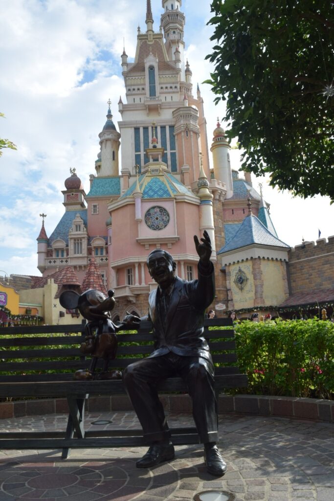 キャッスル・オブ・マジカル・ドリームの裏側に行くと、ベンチに座ったウォルト・ディズニーと、その隣にはミッキーがいます。ベンチに座って、一緒に写真を撮ることもできます。
