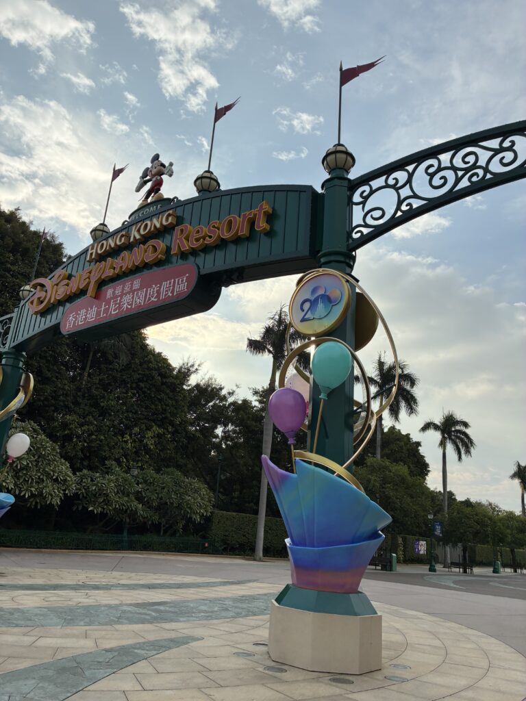 ここは、香港ディズニーランドの大きな門があります。レトロな風貌のミッキーと、香港ディズニーランドの英語と中国語のロゴが記されています。