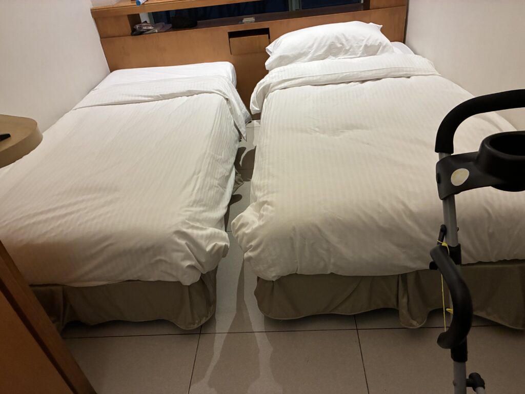 ファミリールームを予約しましたが、1ルームやコネクティングルームではなく、シングルベッドが2台の部屋を2部屋借りることになっていました。そのため、隣の部屋に行くのにルームキーでいちいち開けなければならなかったので、結構大変でした。