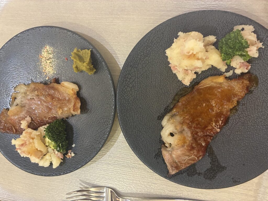 ベーコンの塩味がきいたマッシュポテトとブロッコリーが、お肉と合ってておいしかったです。