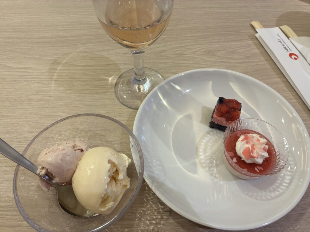 デザートは、ゼリー、ミニケーキ、プチシュー、アイスクリーム。
