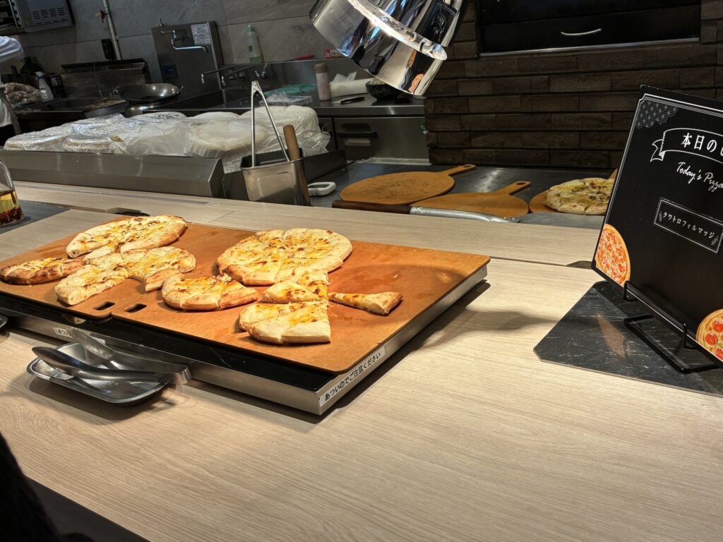 昼食メニューは、窯焼きピザ、ピラフ、から揚げ、甘酢餡の肉団子、ビーフカレー、野菜ビビンバ、味噌ラーメンなど。