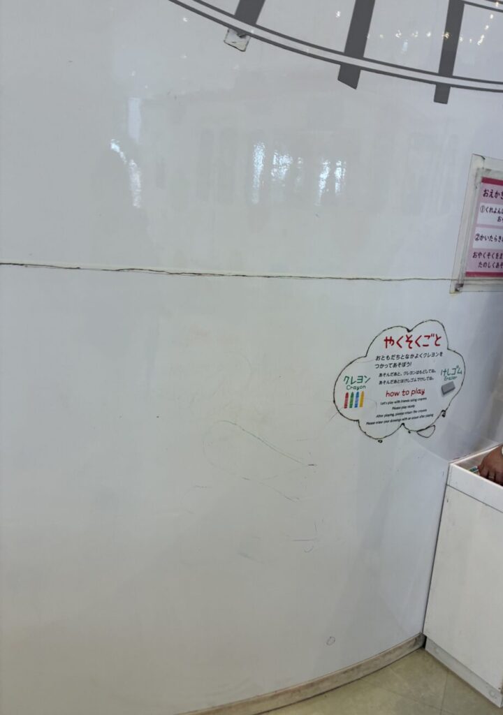 壁に絵をかけるスペースもあり、好きな電車や新幹線の絵をかいて遊ぶことができます。