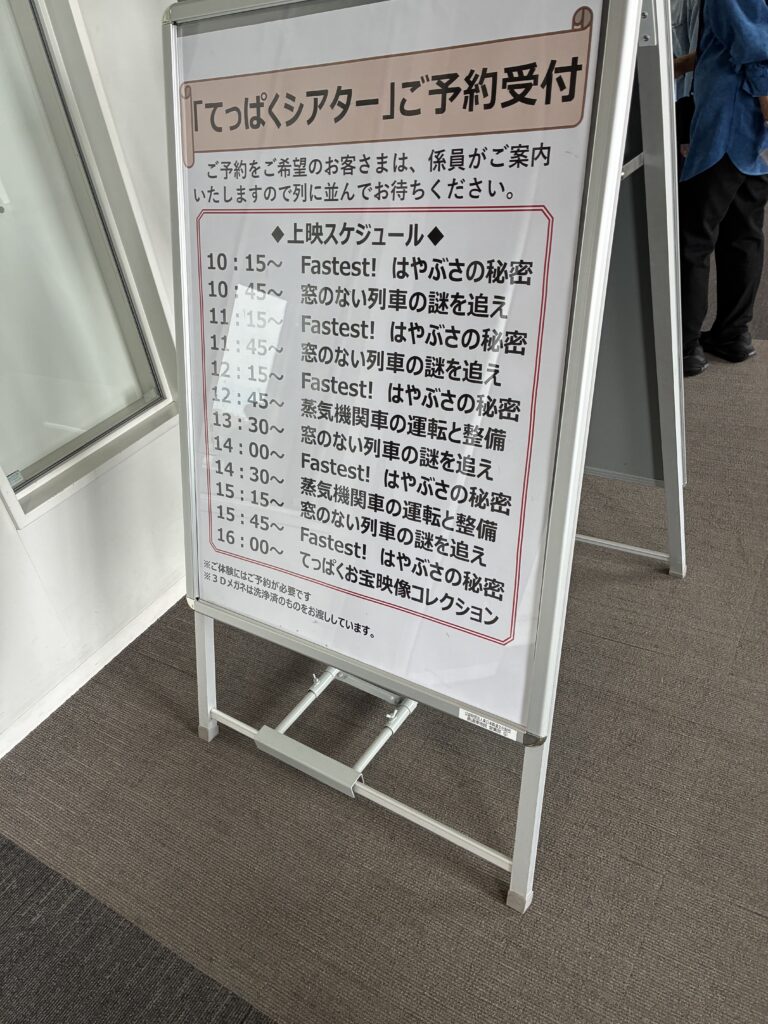 「Fastest!はやぶさの秘密」、「窓のない列車の謎を追え」、「蒸気機関車の運転と整備」、「てっぱくお宝映像コレクション」などを上映していました。