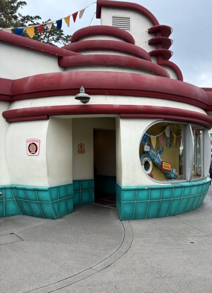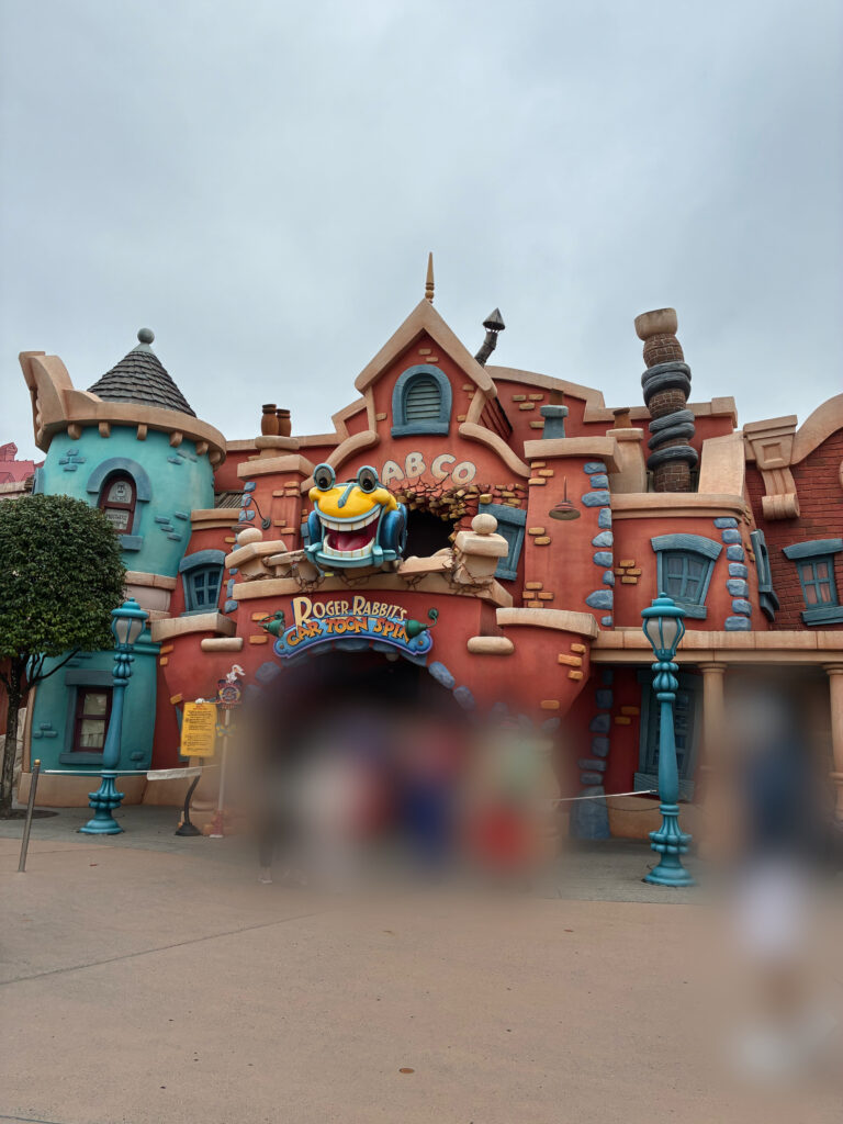 車が飛び出したような外観が特徴的なアトラクション、ロジャーラビットのカートゥーンスピン。ここの隣にベビーセンターがある。
