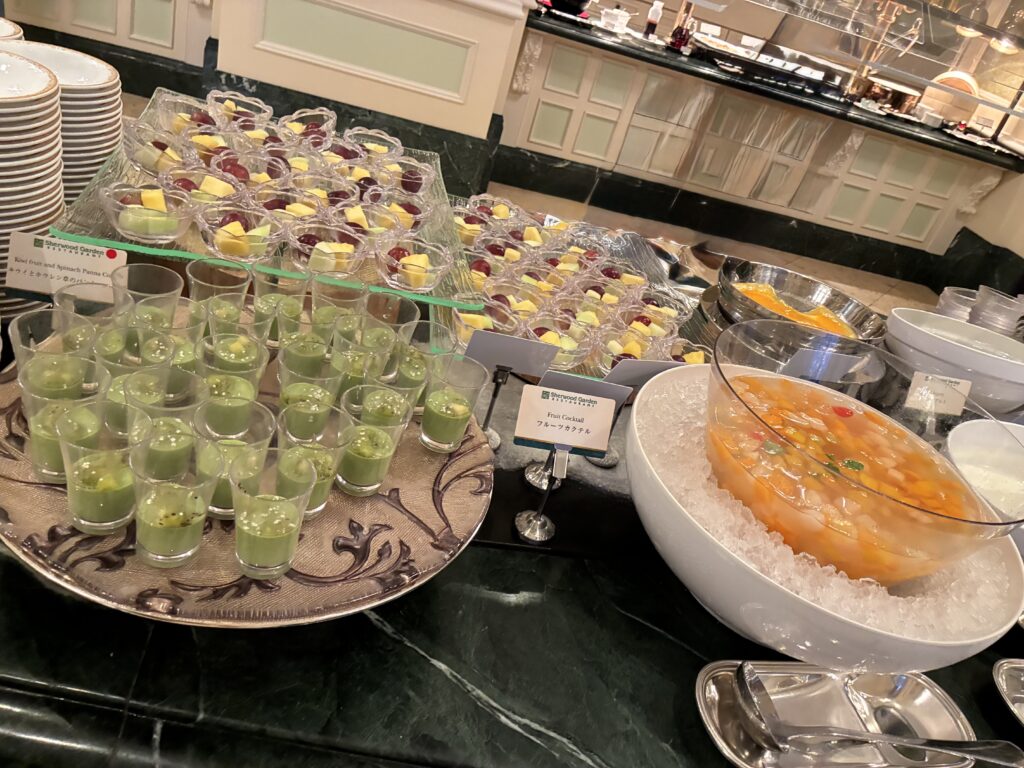 フルーツカクテル、マンゴーゼリー、マスカットゼリー、キウイとホウレンソウのパンナコッタなどのデザートも豊富。
