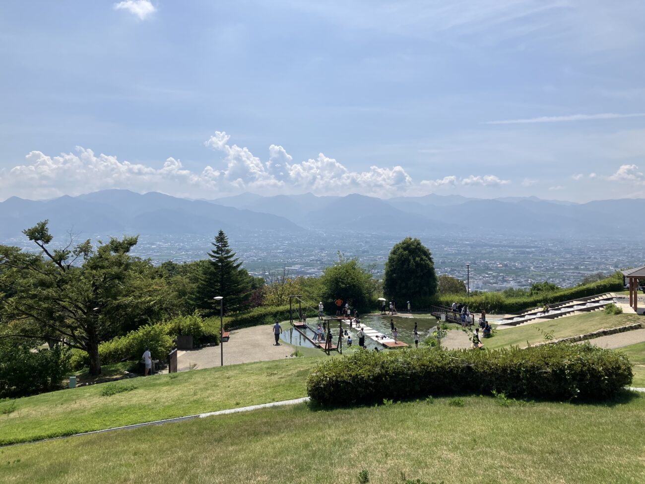 山梨県にあるフルーツ公園。標高約600mに位置し、天気が良ければ富士山をはじめとする山々や、甲府盆地が見渡せます。